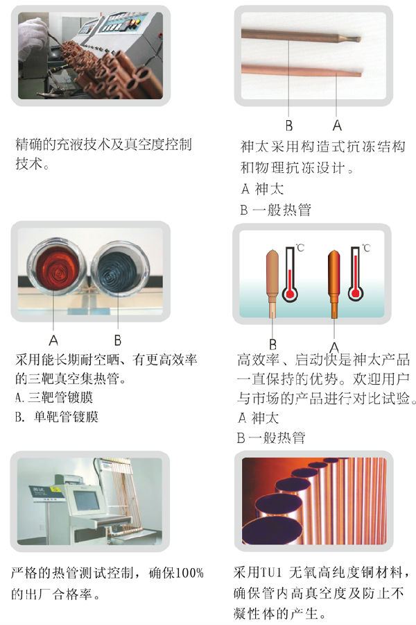 4.采用神太高效熱管的產(chǎn)品,晴天產(chǎn)55℃熱水量:100-130kg/平方米。